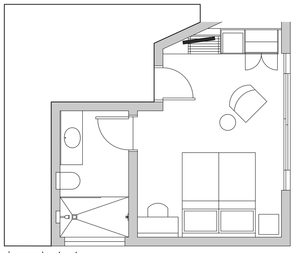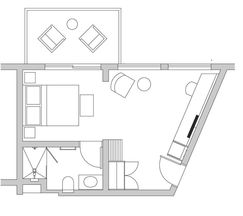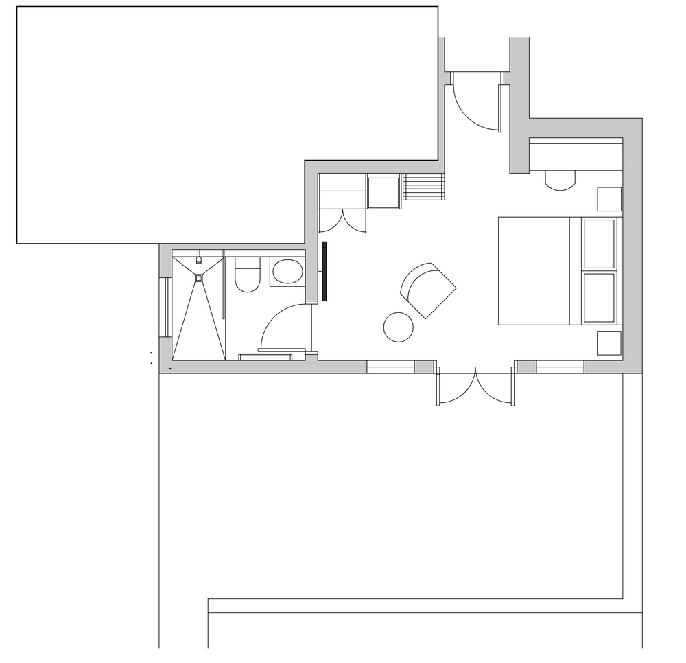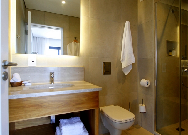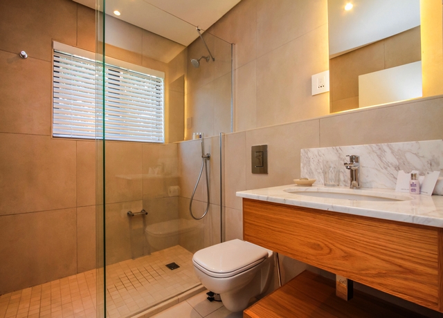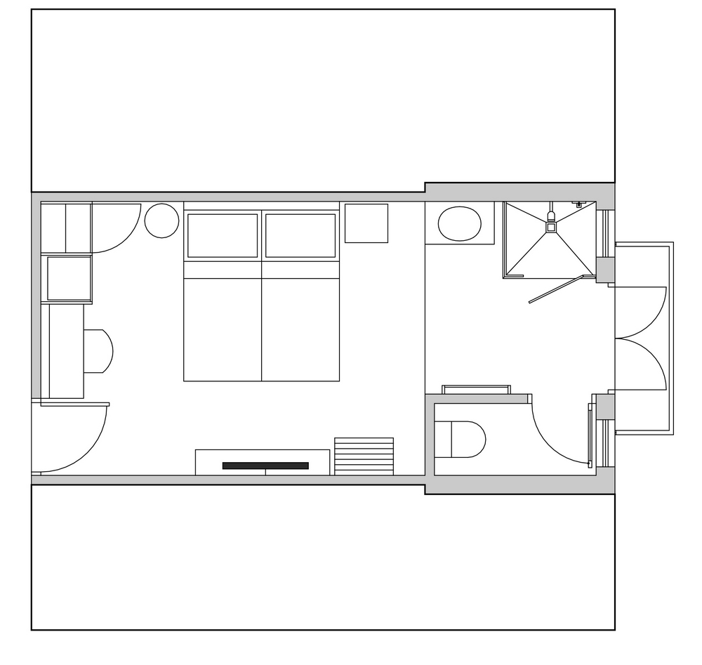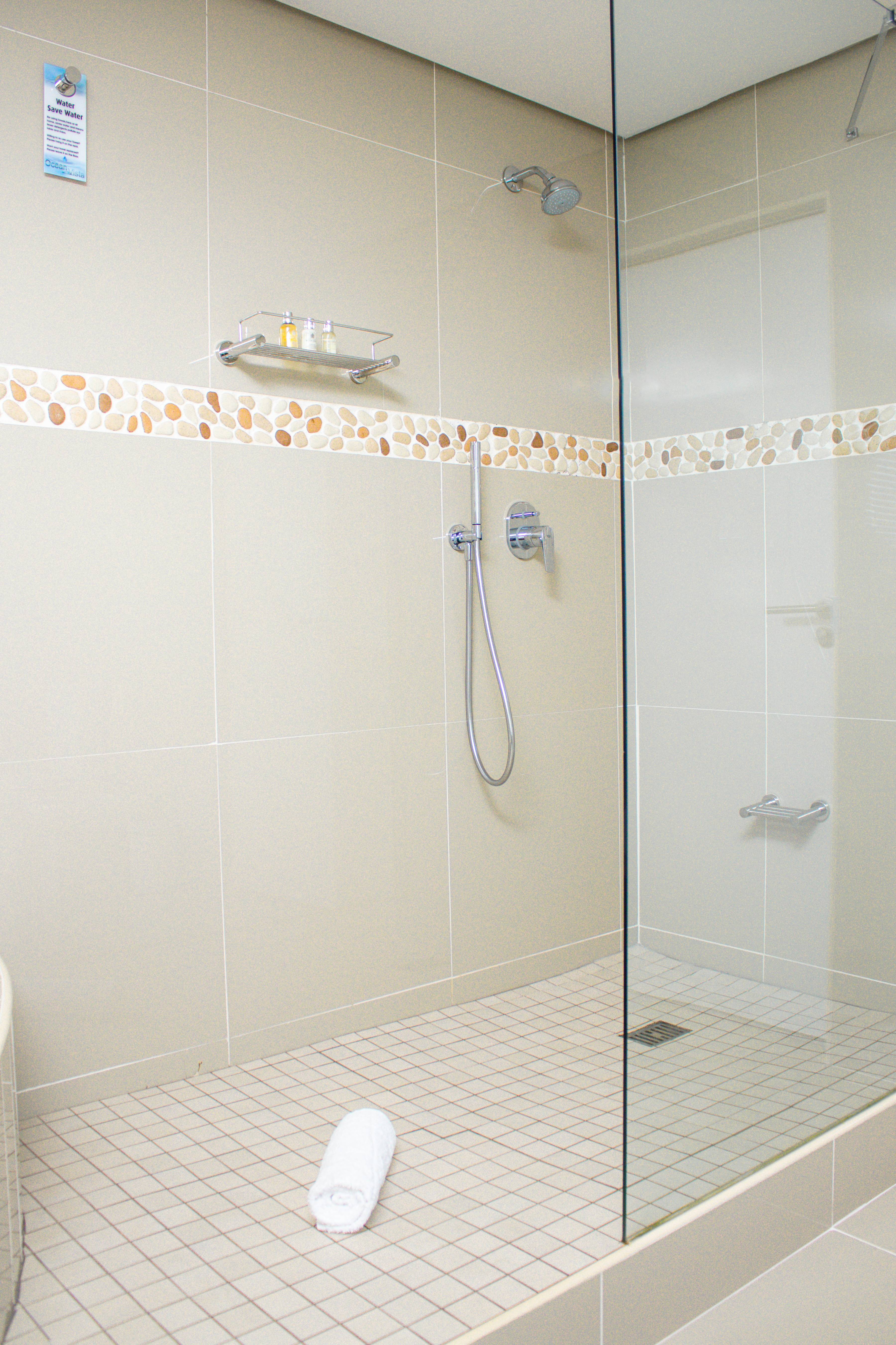(20.5 m²) – Standard room for up to 2 guests, situated on the lower ground floor, with an open plan shower concept and a separate toilet for privacy. Decorated in elegant muted tones and appointed with all the quality fixtures and an extra length King Size bed, which can be converted to twins. The room has a French door opening to a small deck of 2 m² overlooking the garden and offering amazing views of the ocean and all the sounds that go with it. You can glimpse outdoors even when you are in the shower.