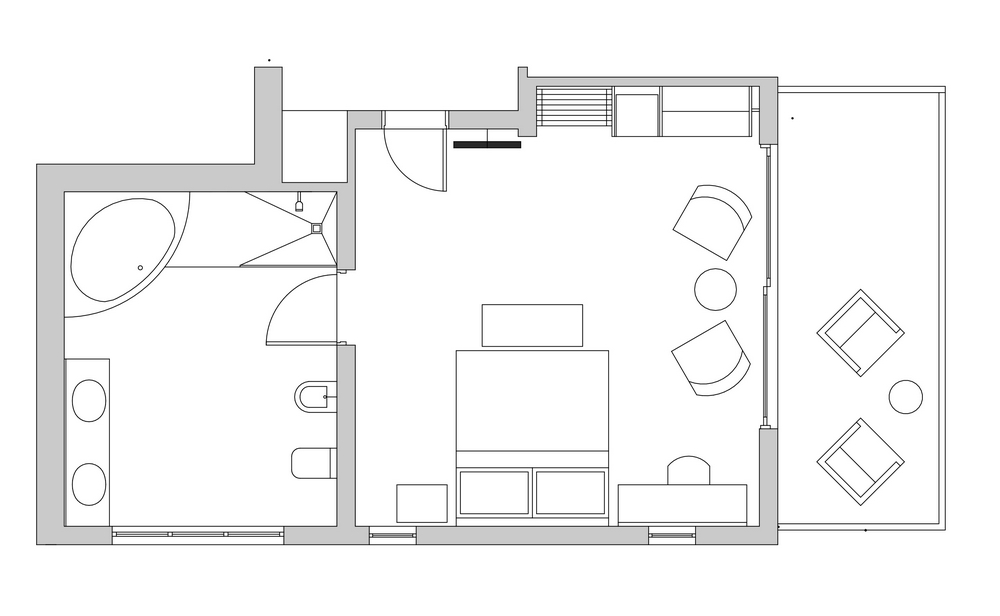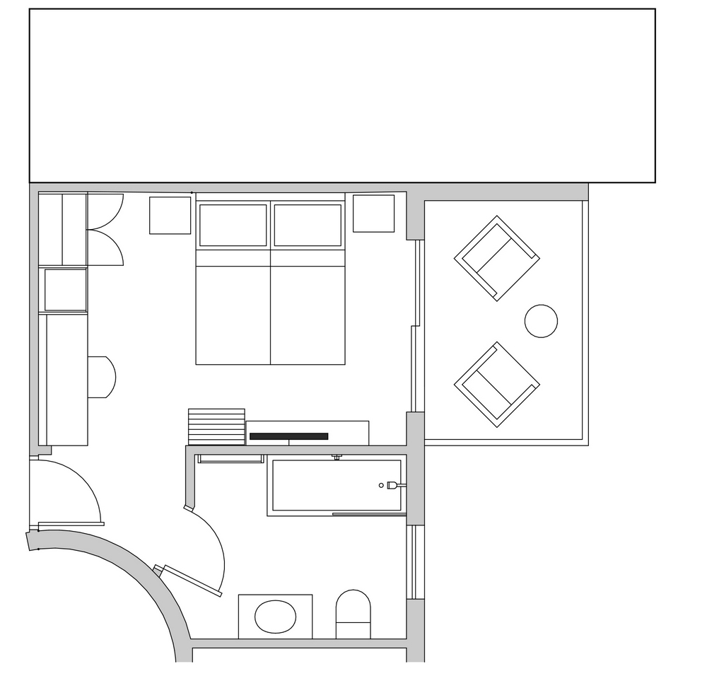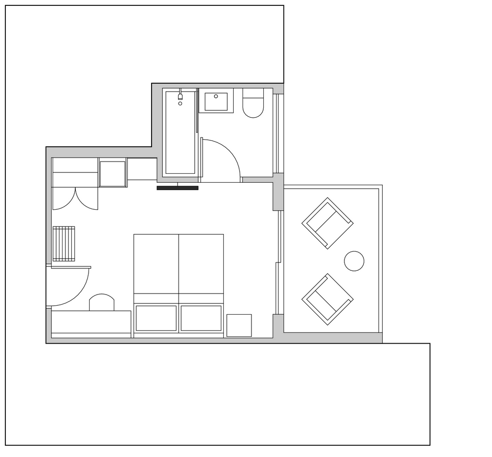 (22.5 m²) – Standard room with ocean views, situated on the lower ground floor with its own private deck of 6 m². Pleasantly light, it comprises of a bedroom decorated in neutral tones and a spacious ocean view bathroom. The extra length bed can be either twin or extra-large King and has anti-allergenic duvet and pillows. The room opens onto a private patio, to enjoy fresh air, sounds of birds in the garden or the nearby tree tops and breath-taking ocean views.